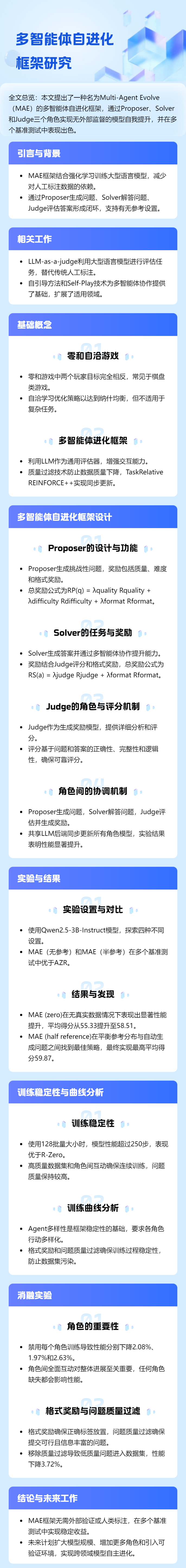 原始摘要:Reinforcement Learning (RL) has demonstrated significant potential in enhancing the reasoning capabilities of large language models (LLMs). However, the success of RL for LLMs heavily relies on human-curated datasets and verifiable rewards, which limit their scalability and generality. Recent Self-Play RL methods, inspired by the success of the paradigm in games and Go, aim to enhance LLM reasoning capabilities without human-annotated data. However, their methods primarily depend on a grounded environment for feedback (e.g., a Python interpreter or a game engine); extending them to general domains remains challenging. To address these challenges, we propose Multi-Agent Evolve (MAE), a framework that enables LLMs to self-evolve in solving diverse tasks, including mathematics, reasoning, and general knowledge Q&A. The core design of MAE is based on a triplet of interacting agents (Proposer, Solver, Judge) that are instantiated from a single LLM, and applies reinforcement learning to optimize their behaviors. The Proposer generates questions, the Solver attempts solutions, and the Judge evaluates both while co-evolving. Experiments on Qwen2.5-3B-Instruct demonstrate that MAE achieves an average improvement of 4.54% on multiple benchmarks. These results highlight MAE as a scalable, data-efficient method for enhancing the general reasoning abilities of LLMs with minimal reliance on human-curated supervision.