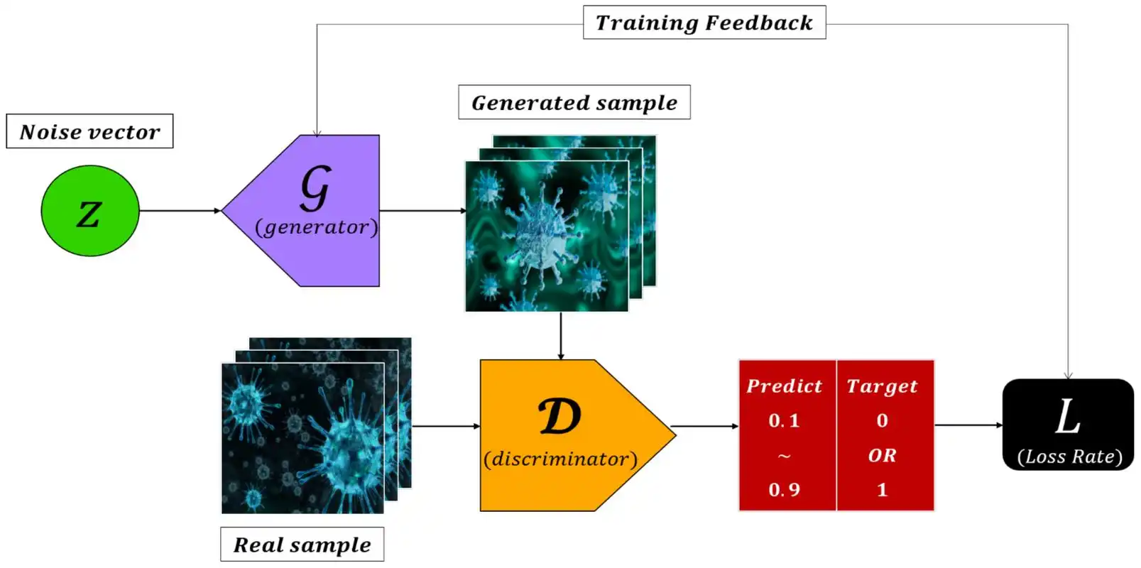生成式对抗网络(GAN)是一类机器学习模型,由两个神经网络组成,一个是生成器(Generator)和一个判别器(Discriminator),它们在零和游戏中相互竞争。生成器创建合成数据样本,而判别器的工作是区分真实和虚假的数据样本。生成器的目标是提高其创造能够“欺骗”判别器的真实数据的能力,而判别器的目标是提高其识别假数据的能力。