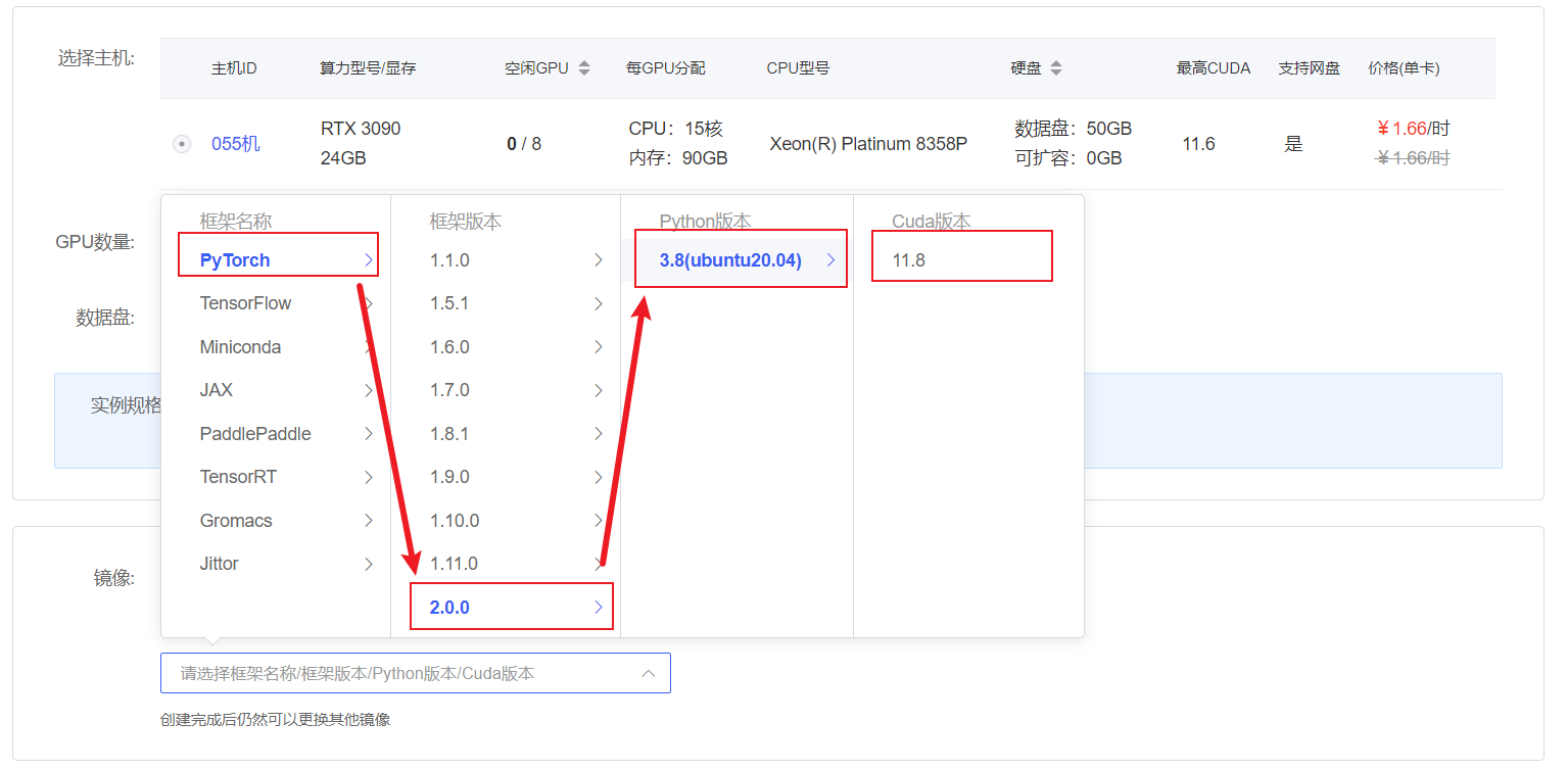 在autodl平台中租一个3090等24G显存的显卡机器,如下图所示镜像选择PyTorch-->2.0.0-->3.8(ubuntu20.04)-->11.8