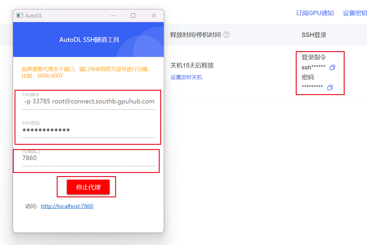 启动代理工具,拷贝对应的ssh指令及密码,设置代理端口为7860,点击开始代理