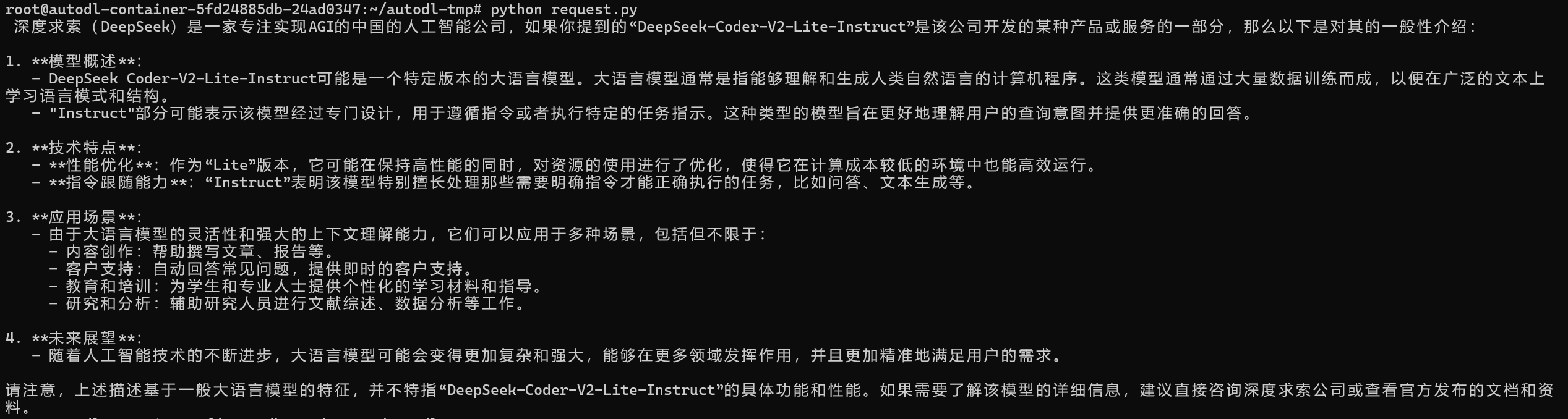 response = requests.post(url='http://127.0.0.1:6006', headers=headers, data=json.dumps(data)) return response.json()['response']if __name__ == '__main__': print(get_completion('你好,帮我介绍一下DeepSeek-Coder-V2-Lite-Instruct大语言模型~'))得到的返回值如下所示: